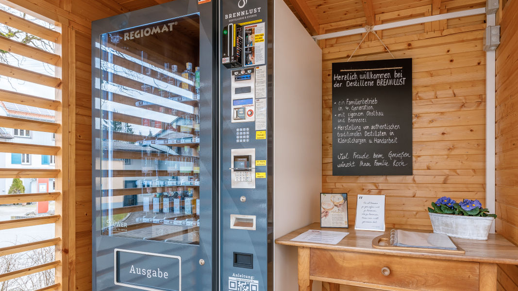 Im Automat sind Obstbrände, Geiste, Gin und Liköre und unser Meladoro Trio. Unter anderem unsere Klassiker wie Williams-Christ, Cox-Orange und Mirabelle, aber auch exotisches wie Orangen-Geist und Ingwer-Walnuss-Likör.